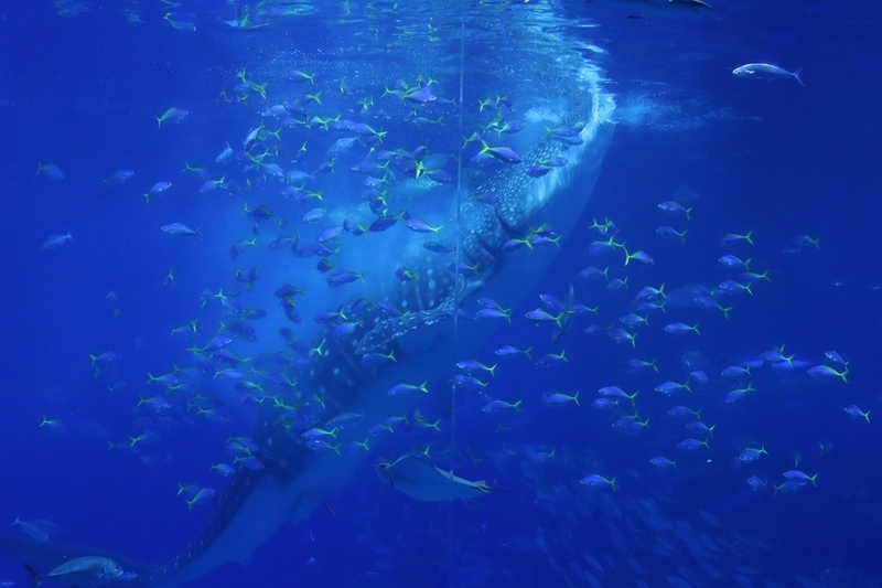 深さ10m・幅35m・奥行27mの大水槽の中には、ジンベエザメとマンタをはじめキハダやカツオの群れが泳いでいます。