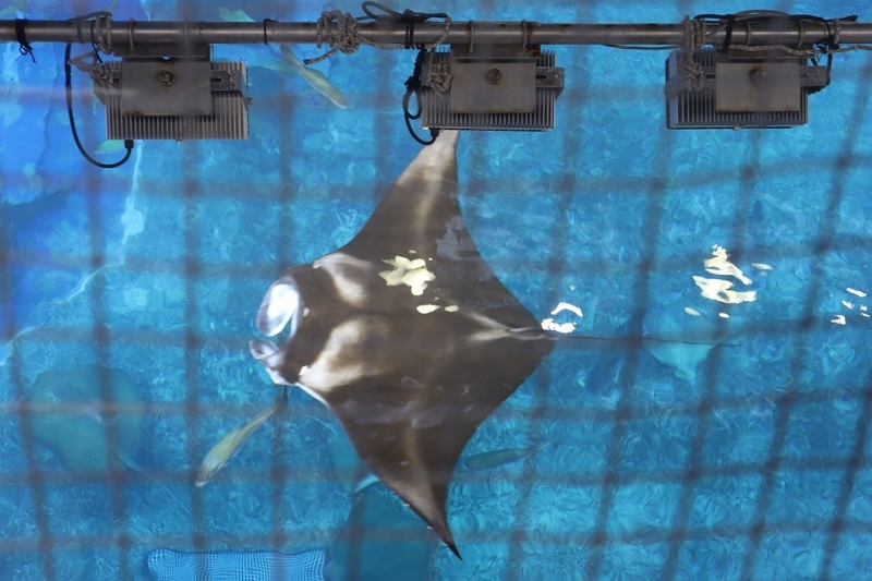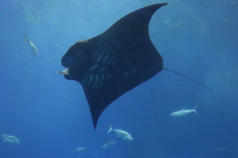美ら海水族館では両方のマンタが飼育されています。スタッフのお姉さんに聞いたところ、1匹のみオニイトマキエイであとはナンヨウマンタ。