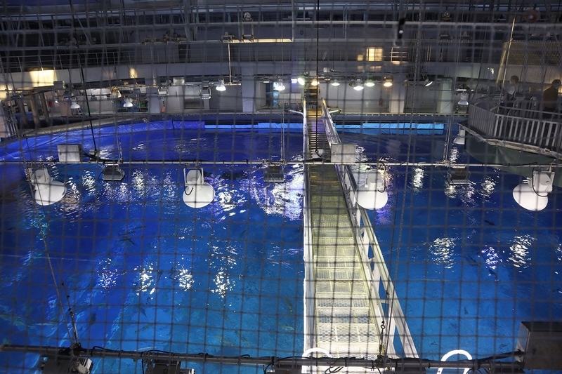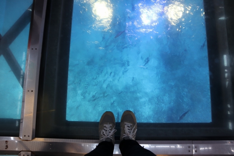 エレベーターを降りると潮の匂い!先ほどまで正面からガラス越しに見ていた水槽が足元にあります。